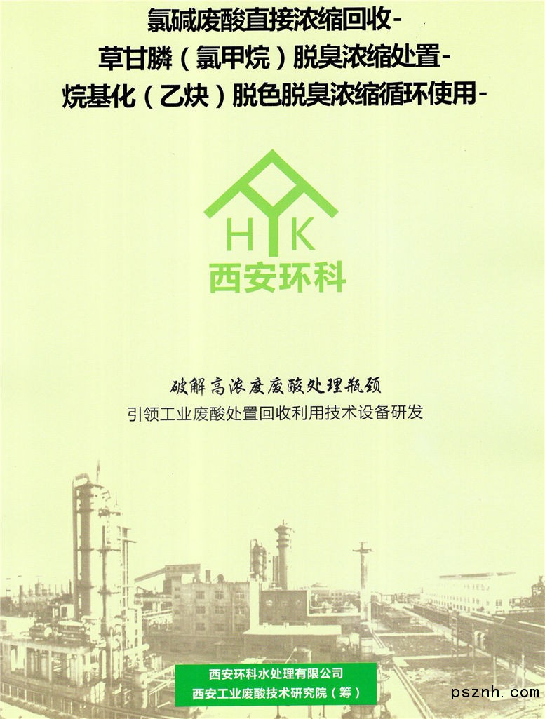 西安環科水處理有限公司經過多年研究,成功研發出應用于鋼鐵、鉛鋅冶煉、印刷電路板、制藥、冶金礦山、五氧化二釩等行業生產過程中產生的廢酸處理設備,研發了低濃度廢酸處理設備、高濃度有機廢酸處理設備(PVC、乙炔、烷基廢酸等)以及特種酸處理設備。為我國廢酸處理專業設備填補了空白,為節能減排做出非常大的貢獻。
