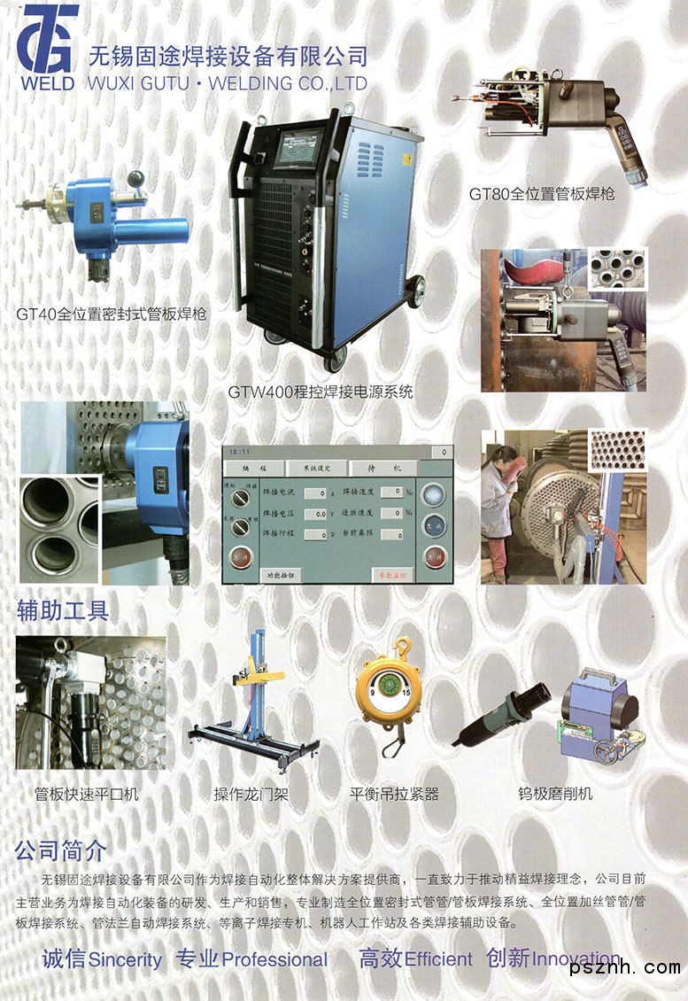 無錫固途焊接設備有限公司作為焊接自動化整體解決方案提供商,一直致力于推動精益焊接理念,公司目前主營業務為焊接自動化裝備的研發、生產和銷售;同時為客戶提供焊接技術優化、焊接現場問題處理、精益焊接制造的技術開發和咨詢,幫助客戶制定完善的解決方案,并同時提供工藝開發、設備升級改造、操作培訓及耗材供應等全套化解決方案,為客戶實現高效率、高質量和低成本焊接,提供全方位的技術支持與服務。主營產品:專業制造管板、管管自動焊機、等離子焊接專機、雙脈沖mig焊機、及各類焊接輔助設備經營理念:可靠的質量、及時的供貨、至上的服務