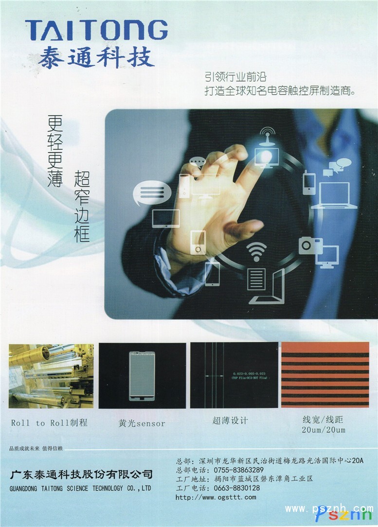 廣東泰通科技股份有限公司是專業(yè)從事電容觸摸屏(Touch Panel/Window)研發(fā)、制造、銷售于一體的高科技企業(yè)。公司于2012年10月8日成立,位于廣東省揭陽(yáng)市經(jīng)濟(jì)技術(shù)開發(fā)區(qū),注冊(cè)資本6000萬(wàn)元,總投資額3億元,占地面積150畝;主營(yíng)產(chǎn)品為膜(Film)結(jié)構(gòu)投射式電容觸控屏(CTP)及模組,年產(chǎn)能3600萬(wàn)片。產(chǎn)品廣泛應(yīng)用于手機(jī)(Mobile)、衛(wèi)星導(dǎo)航系統(tǒng)(GPS)、汽車電子、數(shù)位相機(jī)等中小尺寸可攜式電子產(chǎn)品用ITO觸控面板(Touch Panel/Window),以及筆記本電腦(Note Book)、工業(yè)控制產(chǎn)品、家用電器等大尺寸電子產(chǎn)品觸控面板領(lǐng)域。 公司擁有標(biāo)準(zhǔn)的百級(jí)無塵生產(chǎn)車間(符合Fed-std-209E潔凈室標(biāo)準(zhǔn)),并從臺(tái)灣、日本和法國(guó)等地引進(jìn)國(guó)際先進(jìn)的現(xiàn)代化的全自動(dòng)生產(chǎn)設(shè)備,立足高起點(diǎn),采用了代表觸摸屏行業(yè)未來發(fā)展趨勢(shì)的卷對(duì)卷(Roll to Roll)的黃光制程工藝,可實(shí)現(xiàn)超窄邊框、更高精度和更高良率的產(chǎn)品生產(chǎn),為廣大客戶提供更好的服務(wù)。