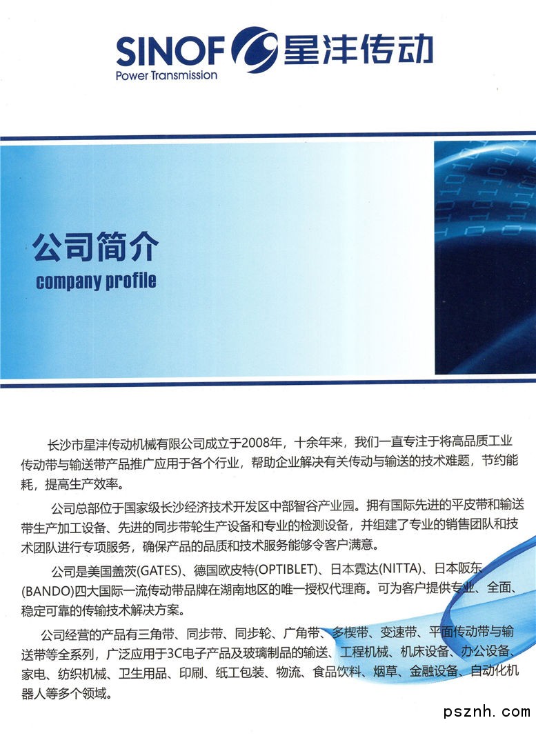 長沙市星灃傳動機械有限公司(原長沙市星豐工業(yè)皮帶有限公司)自2005年始一直專注于工業(yè)傳動帶與輸送帶的研究與服務(wù)事業(yè)。公司經(jīng)營品牌為“SINOF”(司諾豐),專業(yè)生產(chǎn)優(yōu)質(zhì)同步帶和輕型輸送帶的加工。 星灃公司是湖南省內(nèi)目前具規(guī)模、專業(yè)的從事傳動帶和輕型輸送帶的研究和加工的生產(chǎn)型企業(yè)。擁有先進的輸送帶加工設(shè)備和檢測設(shè)備,完善的質(zhì)量控制體系以及專業(yè)的銷售團隊和技術(shù)團隊進行專項服務(wù)。確保產(chǎn)品質(zhì)量和服務(wù)質(zhì)量讓廣大客戶滿意。 星灃公司的產(chǎn)品材質(zhì)從橡膠,聚氨酯(PU),人工合成皮革,聚氯乙烯(PVC),聚乙烯(PE)、聚酯Hytrel、硅膠Silicon等全列,一站式采購,并可提供傳動帶的二次加工服務(wù),如加耐磨(紅綠白黑)膠、PU膠、打孔、開槽、海綿、花紋、裙邊、擋板、導(dǎo)向條、轉(zhuǎn)彎機等,并可免費為客戶提供帶與帶輪的匹配與設(shè)計選型和配套供應(yīng)服務(wù)。產(chǎn)品廣泛應(yīng)用于紡織、印染、機場物流、煙草、運動、木工、食品、汽車制造、陶瓷、鋼鐵、石材加工、造紙印刷等行業(yè)。 星灃傳動公司也是日本三星(MITSUBOSHI)和美國蓋茨(GATES)兩大國際品牌傳動帶的湖南特約經(jīng)銷商,常備庫存量大、交貨期短、并以優(yōu)質(zhì)、專業(yè)的服務(wù)贏得客戶的一致好評。 隨著國內(nèi)經(jīng)濟發(fā)展快速增長,本公司也正處在飛速發(fā)展的進程中,生產(chǎn)規(guī)模日益壯大。我們將立足長沙,輻射湖南,放眼全中國。一如既往的為客戶提供優(yōu)質(zhì)、全面的業(yè)務(wù)服務(wù)!
