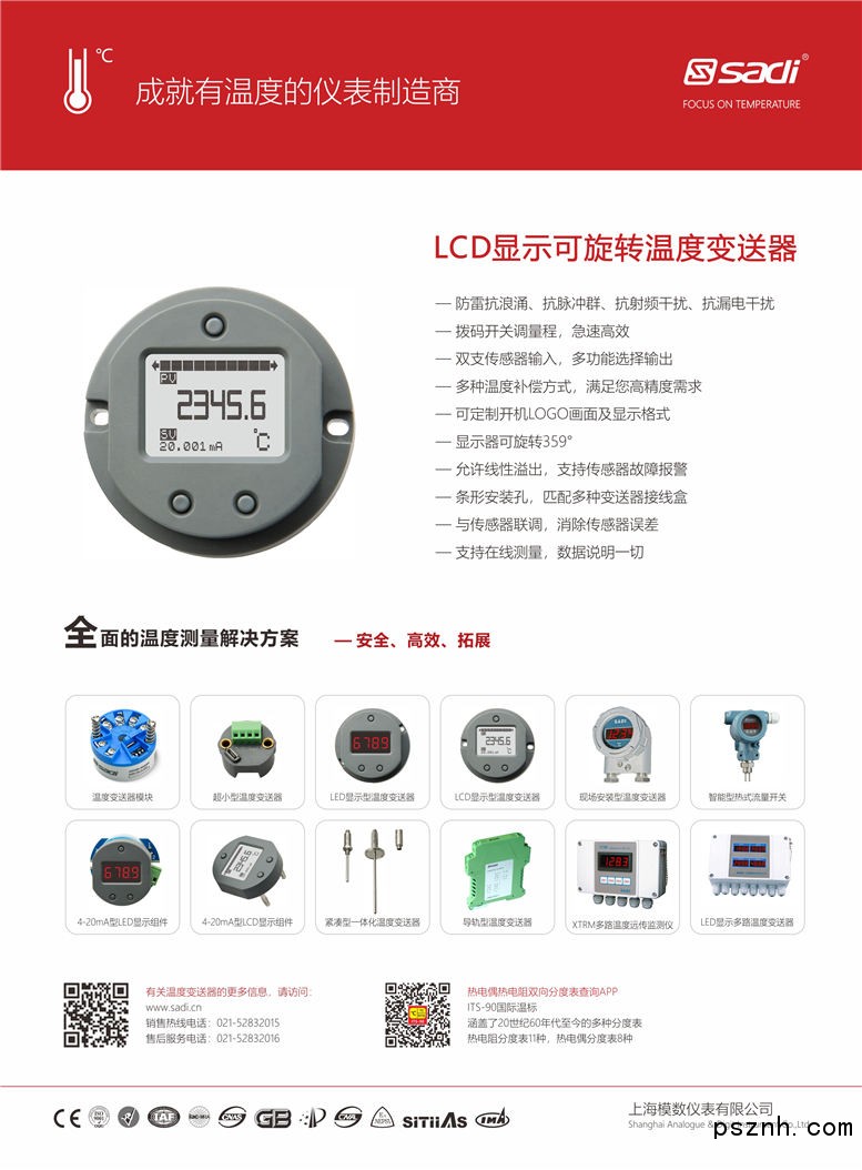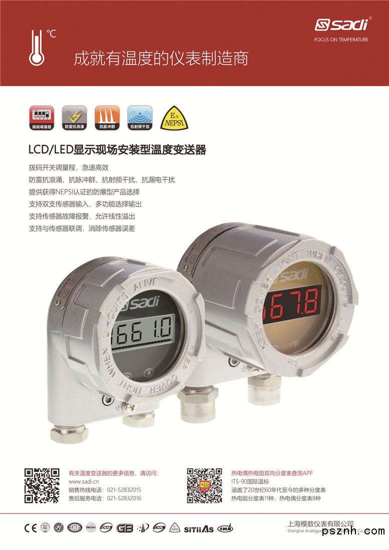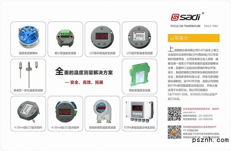 上海模數儀表有限公司 (簡稱:模數儀表 SADI)前身為上海工業自動化儀表研究院(SIPAI-西派埃)XTRM溫度遠傳監測儀項目部。我公司是在上海工業自動化儀表研究院2002年改制時組建而成,公司具有獨立法人資格,是面向工業自動化領域的專業開發、設計、制造和銷售過程控制儀表的高新技術企業,位于有上海陸上大門之稱的普陀區西南部,座落在上海華東師范大學工業院區內。我公司已通過ISO9000 : 2008認證、GB/T19001-2008認證及產品CE認證。