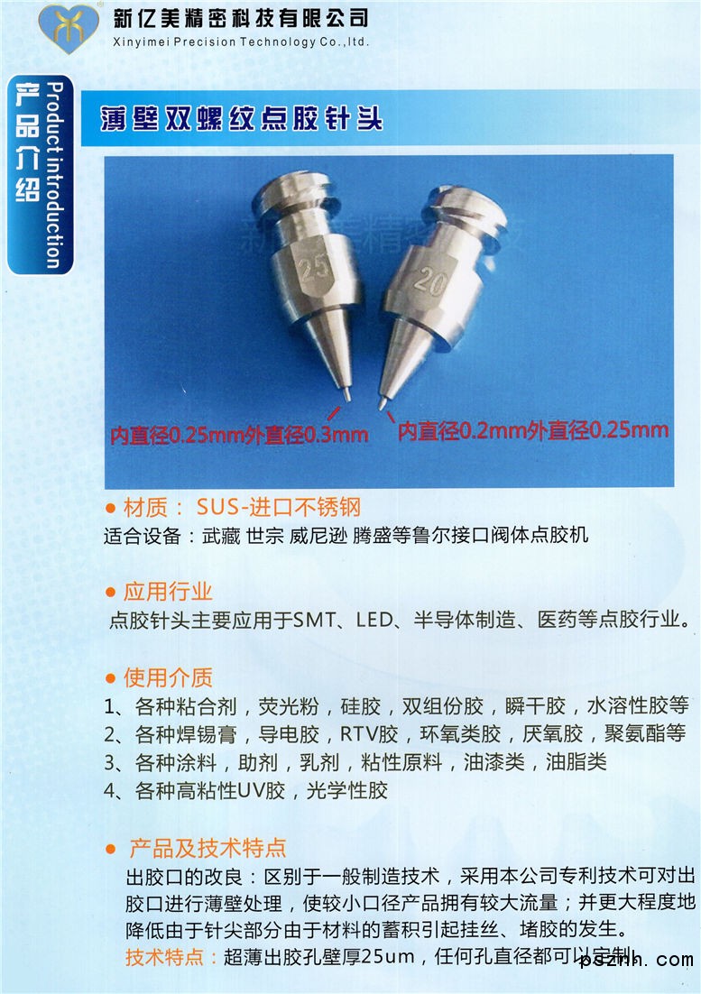 深圳市新億美精密科技有限公司是一家集研發、生產、銷售于一體的高科技企業。我司專注于超高精密不銹鋼零件設計、制造;并可根據用戶樣品或圖紙提供產品,根據客戶需求定制各種高精度非標配件。 產品廣泛應用于電子行業,并提高生產效率和生產質量,同時可以降低企業的生產成本等,因此深得業內人士的信賴,并獲得業內人士的高度評價。 點膠針頭的精度也隨著各種點膠工藝的發展,對點膠效果產生很大的影響,點膠針頭的要求也越來越高,精度不但由點膠閥決定,對點膠針頭的要求更加高,高精度的點膠針頭就發揮著更大的左右,特別是應用于LED,光通訊等微量點膠行業。