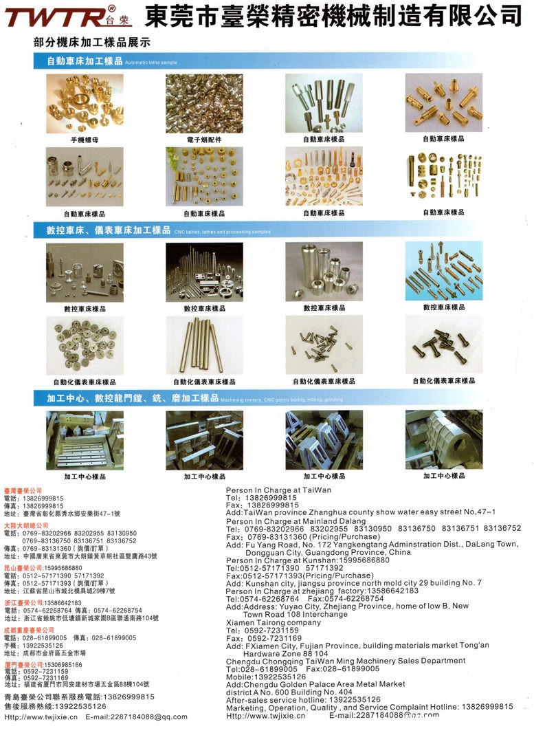本公司系一家臺灣臺榮(集團)獨資企業,全臺灣第一家車床配套最齊全,服務最方便,臺灣公司97年成立于中國大陸,核心部件及檢測,加工設備來自于原裝日本、臺灣、德國。以“車”為主大、小、長、短工件,專業制造高精度車床及周邊配套設備,數控車床(排刀、刀塔、(350、500、1000)、車銑復合、動力頭)、(15#、25#、32#、45#A、45#B、52#、62#)(加工中心:(850#、650#、550#、450#、鉆攻),自動車床(走刀、走心機:從¢1.0-¢42全自動),送料機(棒材、油膜、油浴式:從¢1-¢65全自動送料),銑扁機(軸類、刀動、轉盤、實行全自動),小臥銑(214#、216#可改裝自動),桌上車床:(15#、25#、32#、45#、60#),磨刀機(-3、-5、-7),滾牙機(¢2-¢60全自動滾牙),高精度二次加工專機全自動化車床:(15#、25#、32#、45#、52#、60#),各種機床配件齊全,并整合大量相關配套機械廠,本公司提供技術、培訓、設計、改造自動化生產線,一站式購齊,工廠直銷,量大價優。