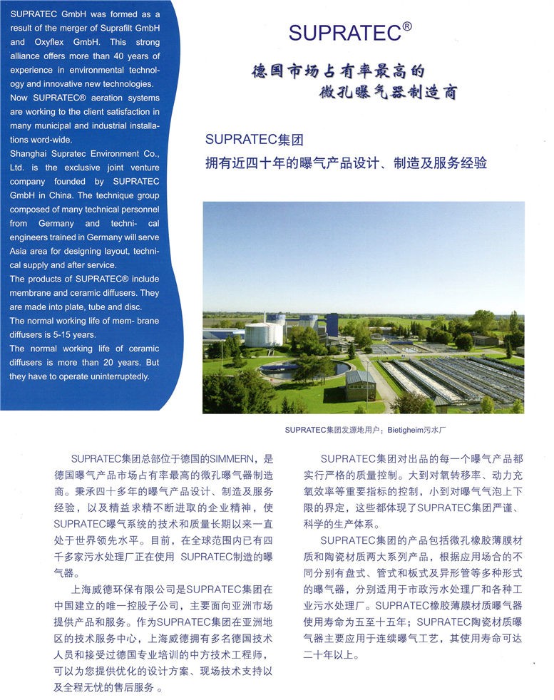世浦泰集團(Supratec Group)中國總部位于上海,歐洲業務總部位于德國Simmern/Hunsrück,是以德國先進成熟的MBR技術、實施工藝和關鍵自有德國核心配套設備為依托的全方位一站式水處理服務提供商,以及智能模塊化村鎮污水處理系統供應商。