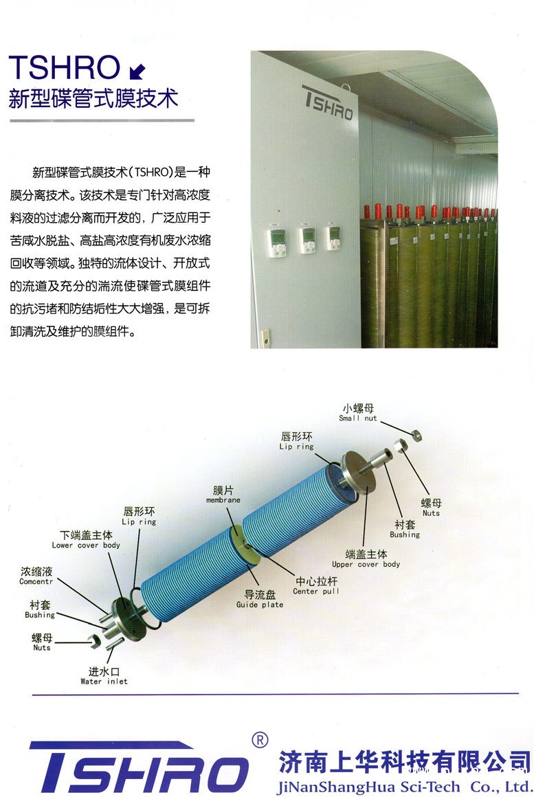 公司研發的 TSHRO 品牌系列的碟管式反滲透( TSHRO )、碟管式納濾( TSHNF )、寬流道反滲透( TSHTRO)、寬流道納濾( TSHTNF )以及高溫高壓碟管式反滲透( TSHHRO )系列產品,廣泛應用于高濃度、高鹽度有機廢水的濃縮減量處理。 特別針對垃圾滲濾液、市政污水、電力、化工、冶金、醫藥、食品、海水淡化、高鹽高濃度有機廢水等行業,和蒸發系統相結合,基本實現透過液回用和廢水的零排放。