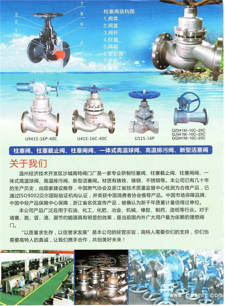 溫州經(jīng)濟(jì)技術(shù)開發(fā)區(qū)沙城高特閥門廠是一家專業(yè)研制,開發(fā)生產(chǎn)銷售鐵、銅、閥門的大型對外型企業(yè).地處獎麗的東海之濱.緊盆104國通.國家一級開放港口溫州港.賢鄰國家級旅游開發(fā)區(qū)一雁蕩山.本廠歷史悠久主要生產(chǎn)超秦牌鐵、鐵鋼、不銹鋼、銅系列的閥門專業(yè)生產(chǎn)廠家,引進(jìn)先進(jìn)技術(shù)生產(chǎn)的新型節(jié)能柱塞潤.柱賽式閘閥、柱塞截止?jié)?、高溫球閥、離溫排污閥、銅珠閥、銅閘閥、銅截止閥等閥門。由國家建設(shè)部推薦、中國遂氣協(xié)會、浙江省技術(shù)質(zhì)a監(jiān)督中心的檢洲為合格產(chǎn)品,已通過IS09002貝爾國際驗(yàn)證機(jī)構(gòu)認(rèn)證.井榮獲中國消費(fèi)者協(xié)會推薦產(chǎn)品.中國市場保護(hù)品牌、中國中輕產(chǎn)晶保降中心保陣.浙江省名優(yōu)宜傳產(chǎn)品,被確認(rèn)為新千年質(zhì)最計最信得過單位。