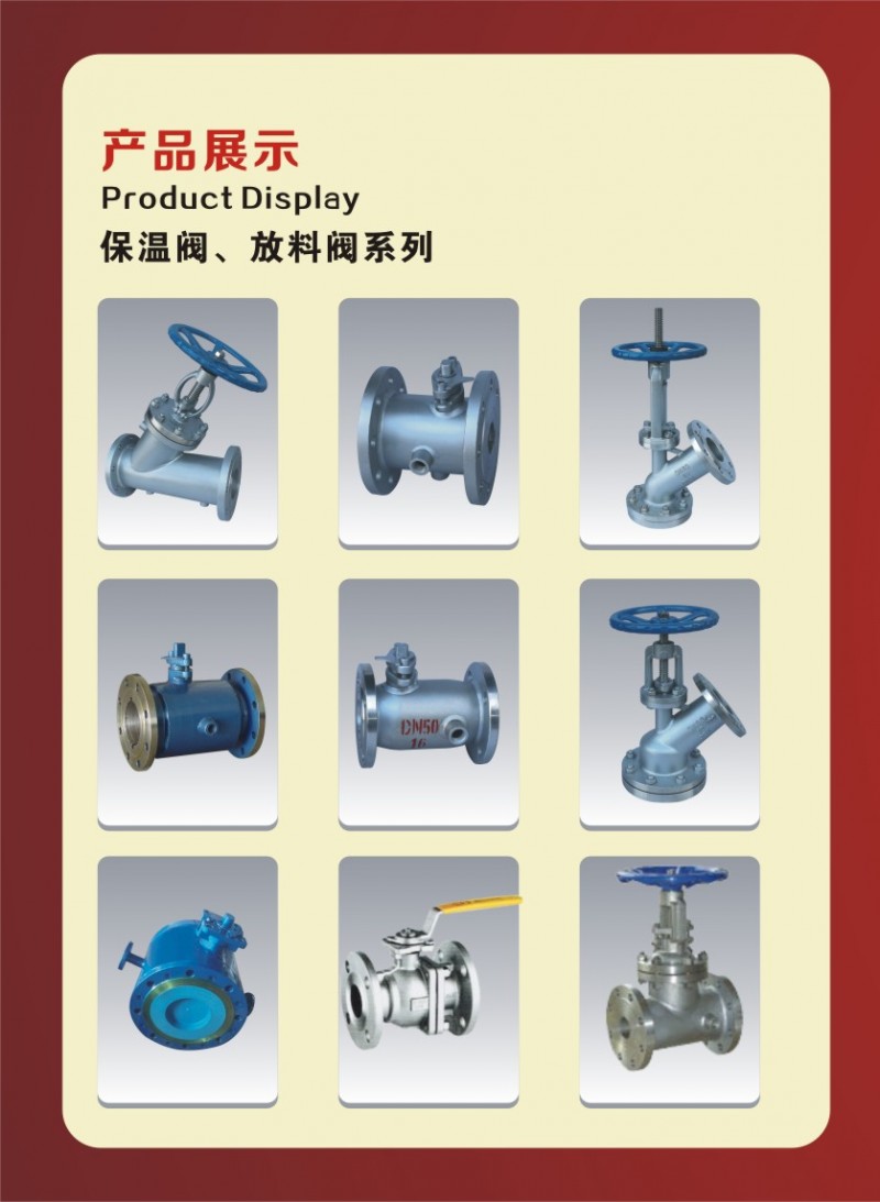 公司主導產品為夾套保溫閥系列閥門,歷經多年的努力和不斷創新,公司設備精良,技術力量雄厚,檢測設施齊全。產品通徑15-300mm,材料有碳鋼、304、316、304L、316L、321、鉻鉬鋼、CF8、CF3、CF3M、CF8M等。