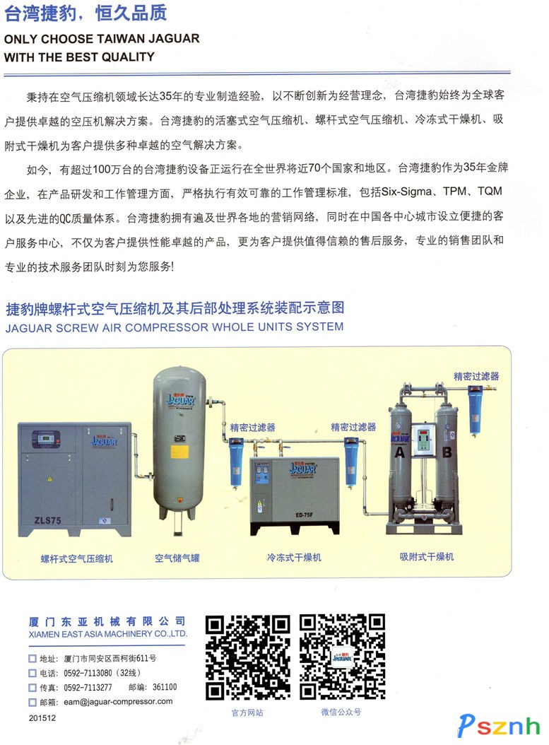 秉持在空氣壓縮機領域長達35年的專業制造經驗,以不斷創新為經營理念,臺灣捷豹始終為全球用戶提供卓越的空氣壓縮機解決方案。臺灣捷豹的活塞式空氣壓縮機、螺桿式空氣壓縮機、冷凍式干燥機、吸附式干燥機為客戶提供多種卓越的空氣解決方案。