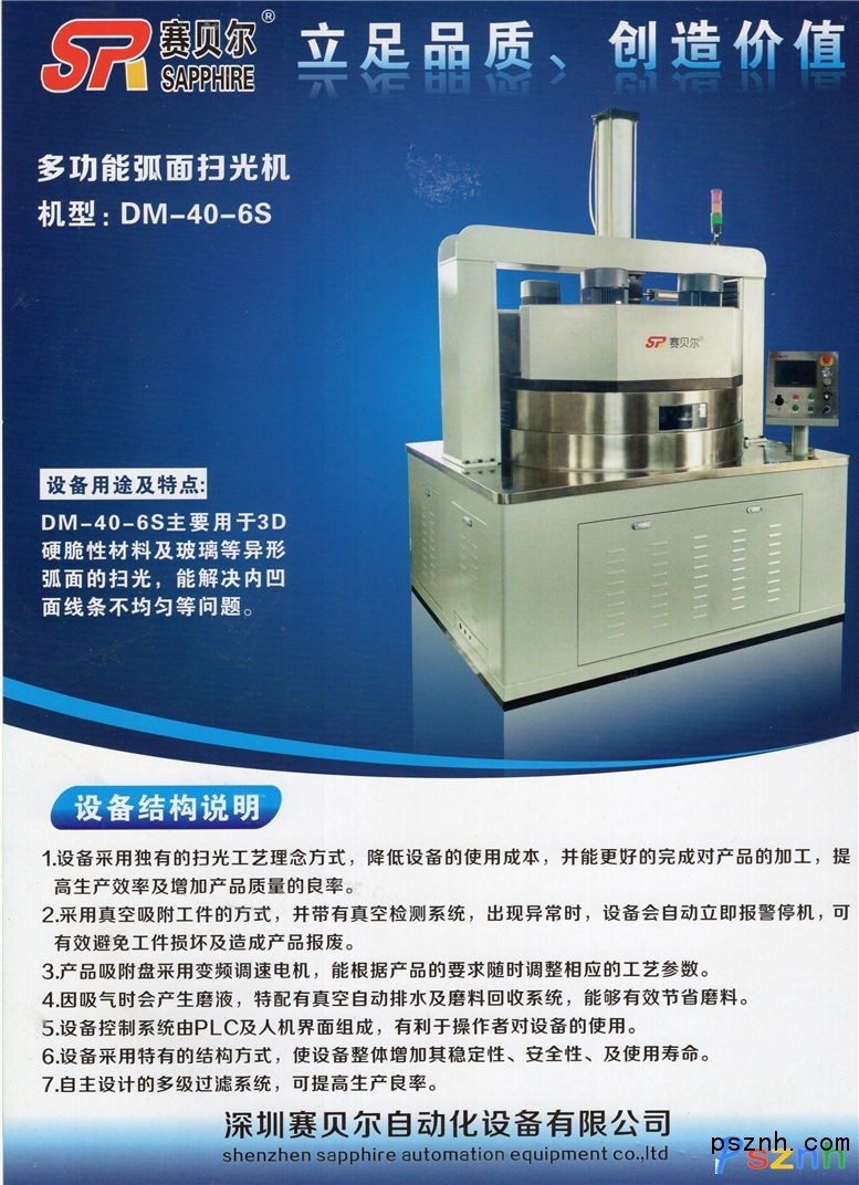 公司主導產品有:針對藍寶石、氧化鋯、金屬、玻璃等精密、超硬材料研磨及拋光的雙面研磨機、雙面拋光機 、單面拋光機;針對弧面鏡片及光邊的光邊機、弧面拋光機、雙弧面精研拋光機;針對藍寶石、氧化鋯超薄片的磨拋加工(0.08mm~1.0mm);針對異形產品加工專門設計開發的各類加工專用設備。公司對藍寶石、氧化鋯、金屬等材料有成熟工藝,購買設備培訓工藝,歡迎來樣試加工。