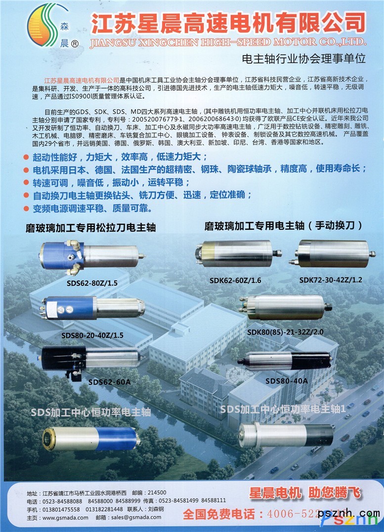 江蘇星晨高速電機有限公司是中國機床工具工業協會主軸分會理事單位,江蘇省科技民營企業,江蘇省高新技術企業,江蘇省百家優秀科技成長型企業,國內電主軸行業標準起草單位之一,是集研發、設計、生產于一體的高科技公司。