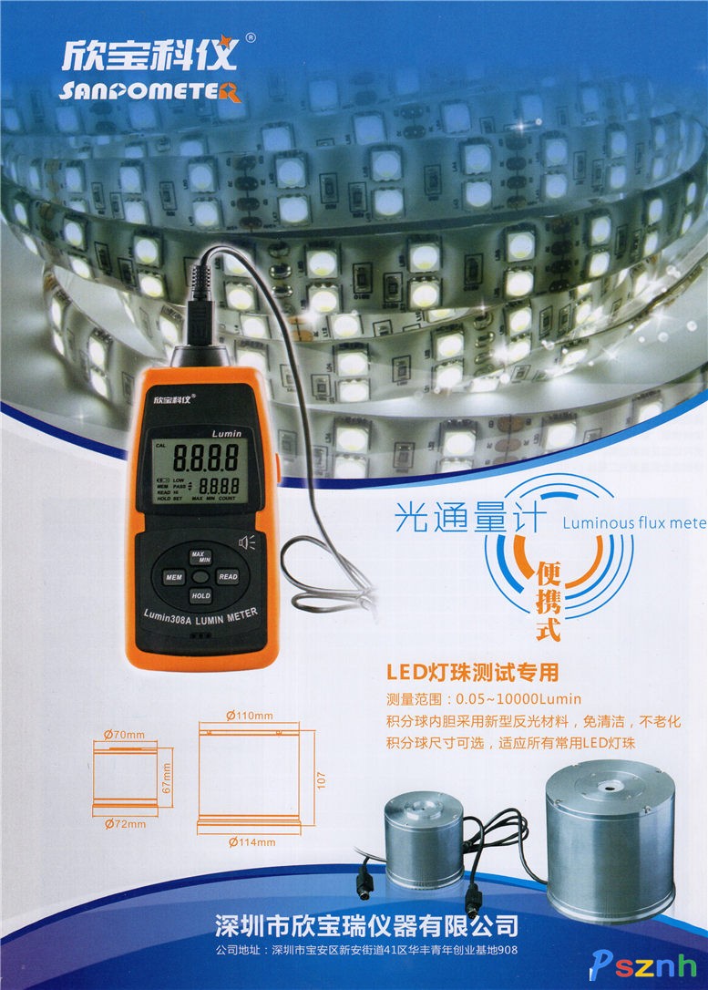 深圳市欣寶瑞儀器有限公司創辦于1998年,是集儀器儀表開發、生產、銷售于一體的企業,注冊商標為“欣寶科儀”, 英文商標為“sanpometer”。主要系列產品有:轉速表、照度計、溫度表、紫外線強度計、紅外測溫儀、木材水分儀、氣體探測儀、電池內阻電壓表、電磁場強儀、聲級計等。