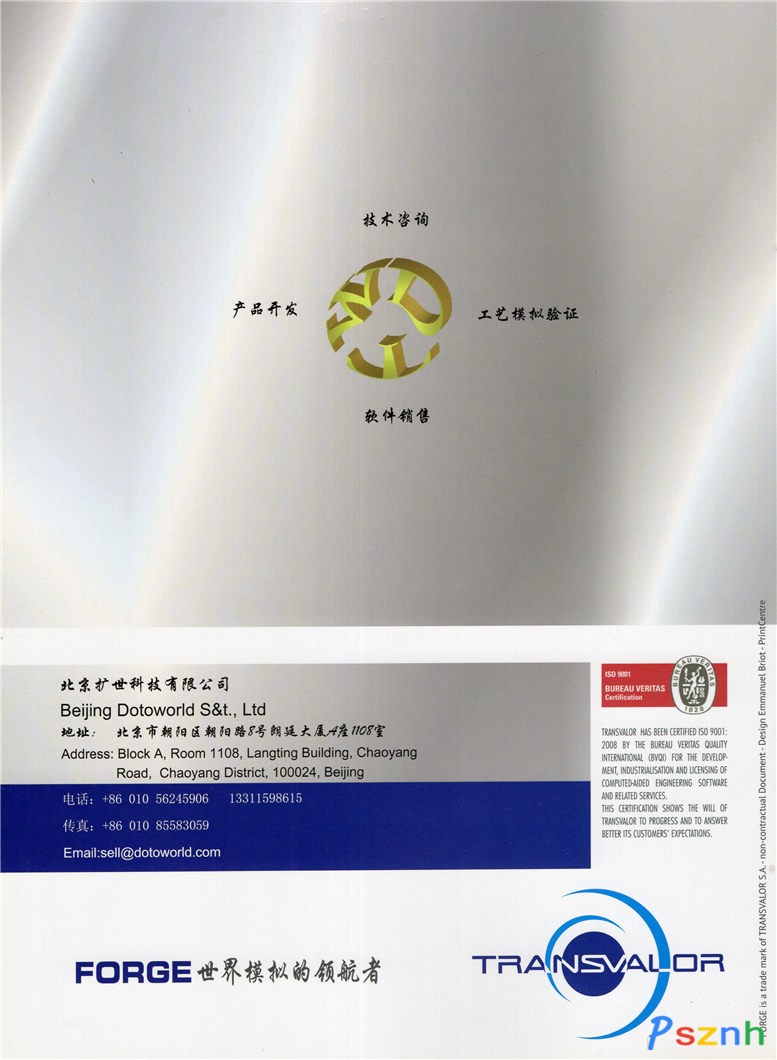 1. 主要致力于鍛造模擬軟件的開發(fā)完善,并在中國大陸銷售Transvalor系列軟件,并負責(zé)相關(guān)軟件售后服務(wù),我公司在售軟件包括Forge2009、 Forge2011、Thercast、Coldform。其中Forge2011所有模塊已經(jīng)由我公司完成了漢化,操作者很快就能掌握這個軟件的操作應(yīng)用。最新版本為FORGE@NXT1.1
