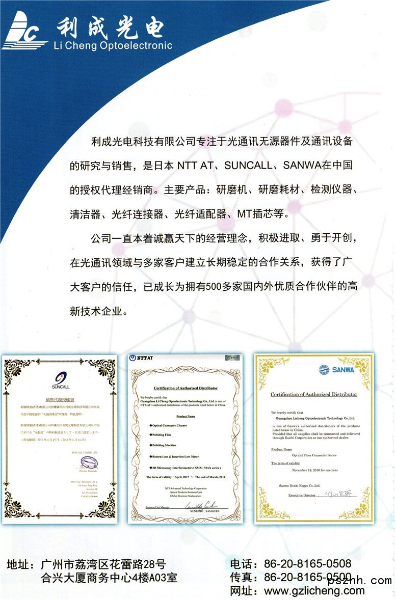 廣州市利成光電科技有限公司專注于光通訊無源器件及通訊設(shè)備的研究與銷售,是日本 NTT AT、SUNCALL、SII 與SANWA在中國的授權(quán)代理經(jīng)銷商。