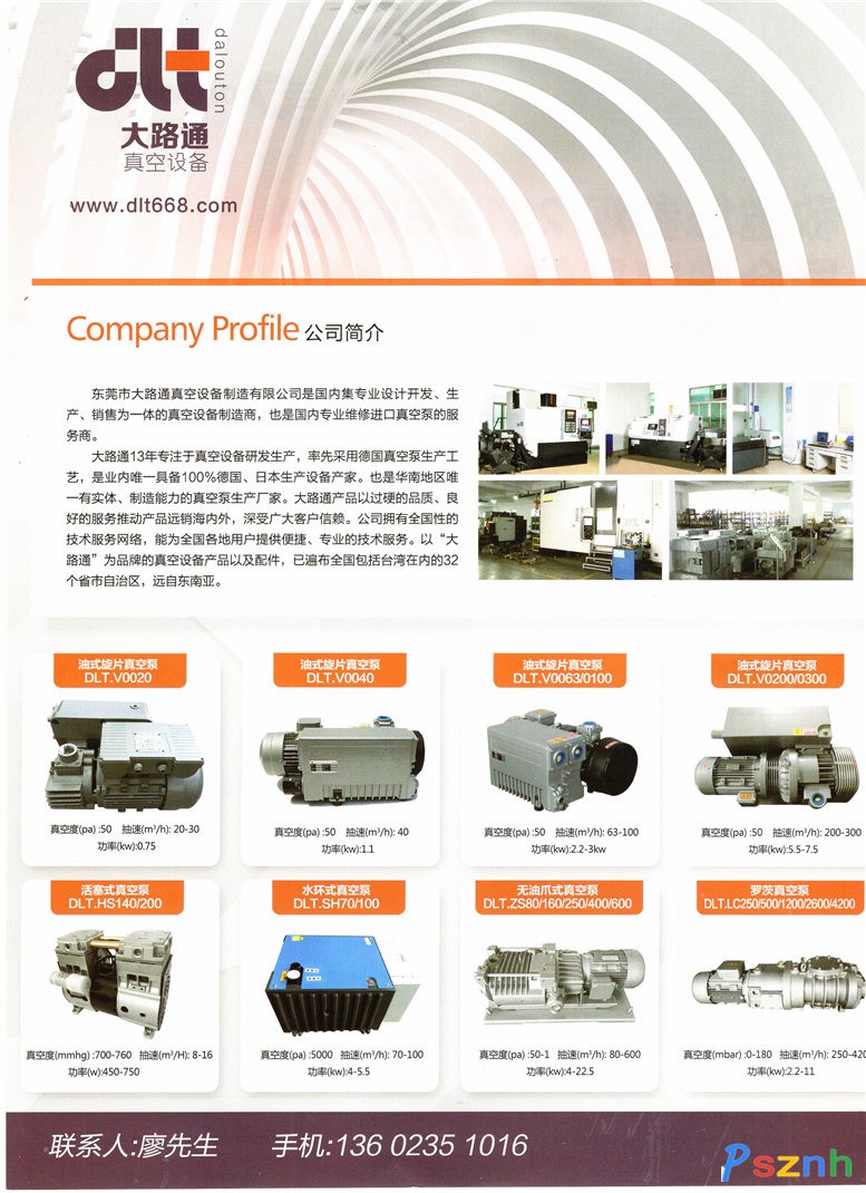 大路通真空設備制造有限公司成立于2003年,位于廣東東莞。是一家由研發、生產、銷售為一體的真空泵設備專業制造廠家。公司占地面積約4600平方米,是國內一家集真空泵制造、真空泵配件生產、真空泵維修、真空系統、真空機組等真空設備生產廠家。我司現專業生產油式旋片式真空泵(單級、雙極)、無油爪式真空泵、羅茨真空泵、無油活塞式真空泵、無油螺桿真空泵、水環真空泵、真空機組、真空系統。
