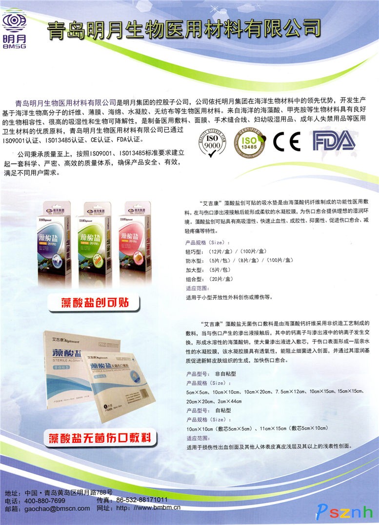 青島明月生物醫(yī)用材料有限公司 海藻酸鹽纖維 無紡布 敷料