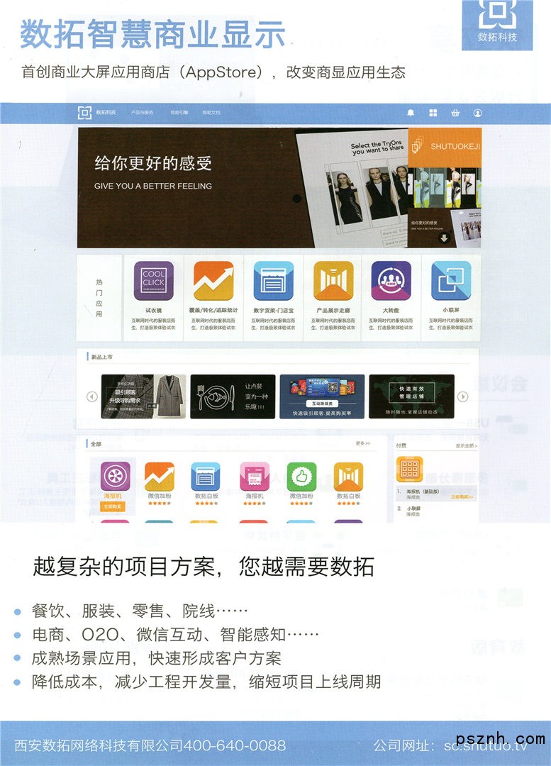 數拓科技由海外歸國人士組建,是國內最早的移動互聯網應用開發商之一。公司專注于數字化展示技術、互動技術、移動互聯網技術、云技術、物聯網技術的商業化應用,為集團公司、政府機關、金融銀行、醫療教育、中小企業、零售門店等政企、商業用戶提供完整的數字化營銷解決方案。數拓科技的主要產品包括數字易拉寶、數字餐牌、數字收銀臺、觸摸導購臺、數字公告欄、互動拼接屏等一系列軟硬件結合的數字化營銷產品。其主要特點是用手機、平板電腦通過行業應用模板快速制作展示內容并管理屏幕播放,展示內容在數字大屏幕上以動態形式播放,配合攝像頭、近場通信模塊、觸摸屏幕實現更多互動功能。