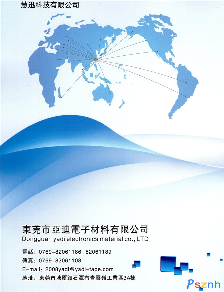 東莞市亞迪電子材料有限公司主要是出售電子方面的材料,我公司主要生產有耐高溫雙面膠帶(無基材,綿紙,泡棉,薄膜), 黃單  (95克,135克) 格拉辛(白色的80克,120克,127克,)       (蘭色的62克,74克,94克,) 離型膜(50U和75U輕的,158U重) 氟素膜(50U,75U,100U) 綠膠  (25U,36U) 白色LED封裝膠帶(霧面和亮面)(25U,36U) 銅箔(25U,36U) 銀箔膠,藍膠,Kapton,