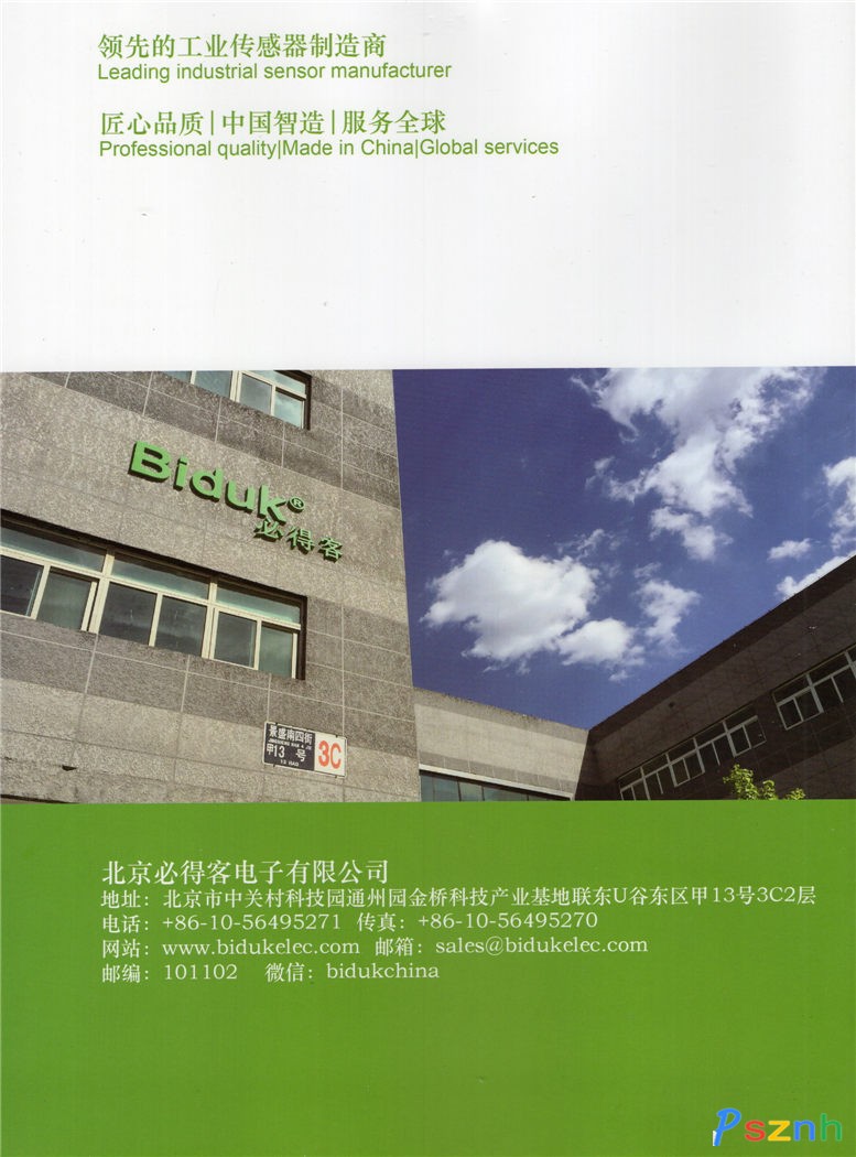 北京必得客電子有限公司 Biduk做為歐美一些知名品牌OEM生產制造商,多年來始終致力于生產、研發工業自動化領域電感式傳感器、電容式傳感器、光電式傳感器等工控產品。產品研發與生產嚴格按照IEC國際標準來設計與控制,至今已匯聚具有豐富傳感器經驗高科技人才,先進的生產工藝和完善的檢測設備,嚴格按照ISO9001質量管理體系要求進行管理,產品已通過嚴格的EMC(電磁兼容性)、IP防護等級、振動沖擊、高低溫等國際標準測試并通過歐盟CE認證和ROHS檢測。  公司擁有十幾個系列數千種不同種類規格功能產品。如今在專業領域內,公司產品和服務的廣度和深度深得客戶親賴,業務范圍也隨之擴及全球。我們的足跡遍布世界航空航天、鐵路、港口、冶金、礦山、機床、紡織、電梯、石油化工、印刷、包裝、食品、建筑、汽車、等行業。為客戶提供國際標準的多種類接近傳感器和多方位快捷的技術服務支持。
