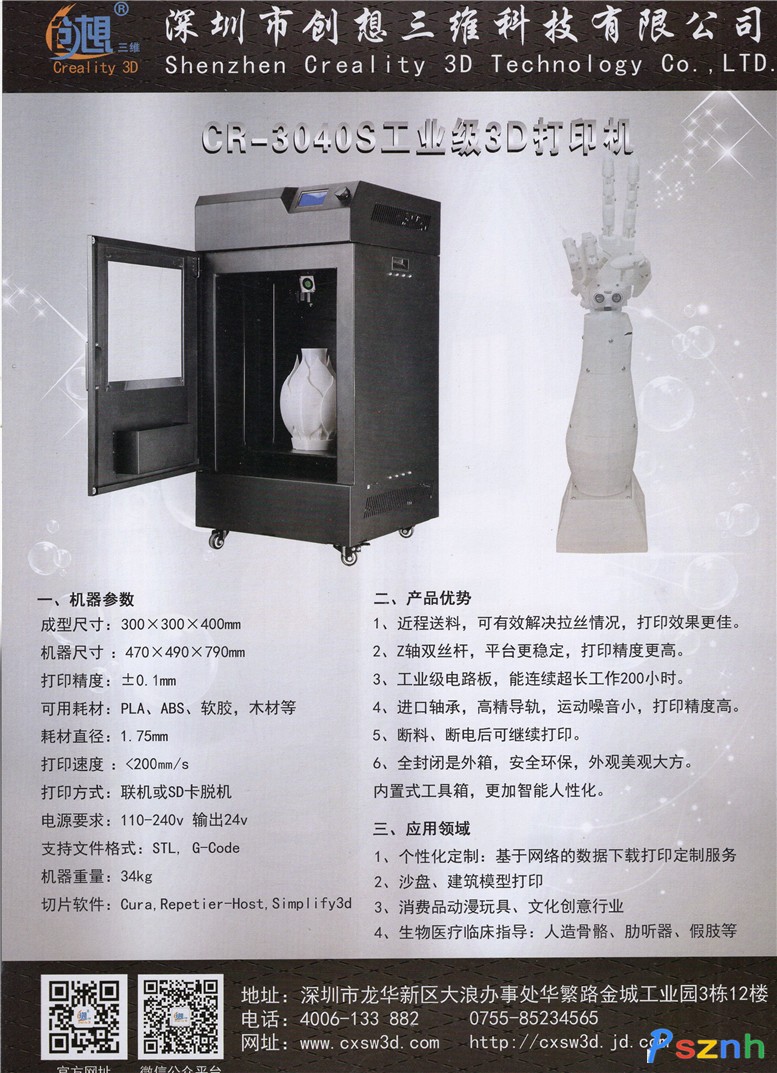 深圳市創(chuàng)想三維科技有限公司成立于2014年,是中國率先進入3D打印行業(yè)的研發(fā)制造商, 致力于建設(shè)全方面的3D打印解決方案,業(yè)務(wù)領(lǐng)域以3D打印機的研發(fā)、制造、銷售為主,延伸到3D打印配件、3D打印耗材、3D教育課程體系、3D打印打印服務(wù)等。目前已成為中國3D打印行業(yè)銷量領(lǐng)先的高新技術(shù)企業(yè),研發(fā)實力、生產(chǎn)及品質(zhì)保證、服務(wù)保障 等多方面均處于業(yè)界領(lǐng)先水平。  “品質(zhì)保證”是‘創(chuàng)想人’驕傲的口碑,讓我們的客戶遍及全球  創(chuàng)想三維投入大量資金建立了大型標準的現(xiàn)代化生產(chǎn)線,年產(chǎn)能達6萬臺。作為從事先進裝備生產(chǎn)的高科技制造型企業(yè),公司具備雄厚的科研基礎(chǔ)和研發(fā)實力,對全系列產(chǎn)品及其工程化開發(fā)流程擁有自主的知識產(chǎn)權(quán),擁有自主知識產(chǎn)權(quán)的技術(shù)與發(fā)明專利數(shù)十項,產(chǎn)品通過CE、FCC、ROHS等多項國際質(zhì)量及環(huán)保認證,并遠銷歐洲、美國、澳大利亞、俄羅斯、英國、德國、新加坡、埃及、印度等三十多個國家和地區(qū)。在中國臺灣、香港、上海、北京、四川、湖北、江蘇、山東等十六個省及地區(qū)有授權(quán)代理商,創(chuàng)想三維CR-7 mini 3D打印機在知名國外眾籌Kickstarter成功眾籌20萬美元,連續(xù) 保持銷量、口碑領(lǐng)先,獲海內(nèi)外客戶的高度認可。