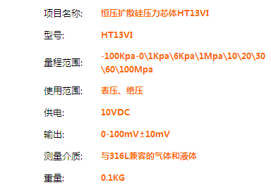 產品描述 :HTxxV系列隔離膜壓力芯體是一種采用恒壓供電的芯體。具有精度高、多種結構、穩定性好等特點,可應用在與316L不銹鋼相兼容的各種液體、氣體壓力的測量和控制。