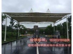 高速公路收費站通常都有收費島、收費亭及行車道三個主要部分,是用來對通行車輛收取通行費用的設施。收費道路或收費立體交叉必須設置收費站。收費站的設置位置一般有兩種:一種是直接設在主線上,也稱為路障式,多用于主線收費路段的起、終點處;另一種是設在立體交叉所道或連接線上,一般用于主線收費路段之間的工通式立體交叉,以控制被交道路上的車輛進、出主線的收費。 為保證車輛行駛暢通,膜結構的長、寬、高都需要滿足收費站所處路段周圍環境和行車類型的要求,因此膜結構的支撐體系的布置受到一些局限,通常設計為骨架式或骨架與張拉結合式。