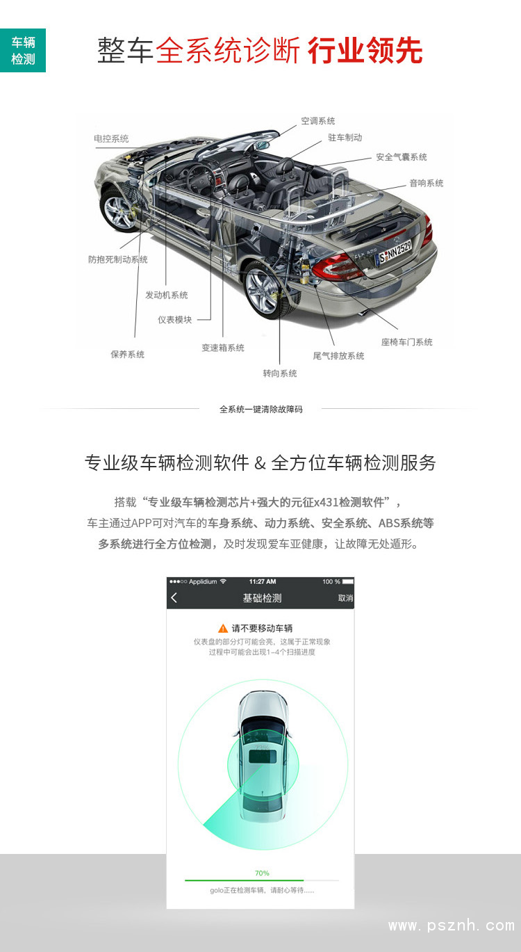 搭載“專業級車輛檢測芯片+強大的元征x431檢測軟件”,車主通過APP可對汽車的車身系統、動力系統、安全系統、ABS系統等多系統進行全方位檢測,并獲得一份專業檢測報告。