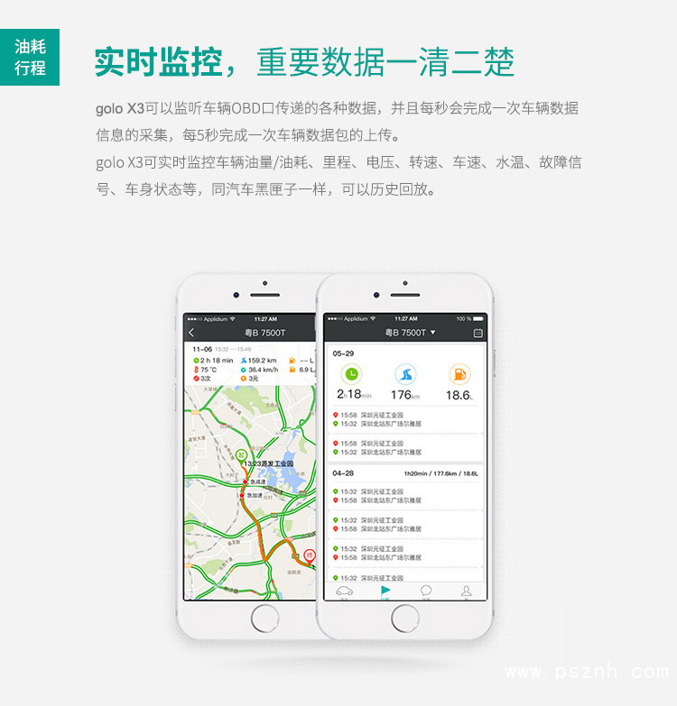 golo X3可實時監控車輛油量/油耗、里程、電壓、轉速、車速、水溫、故障信號、車身狀態等,同汽車黑匣子一樣,可以歷史回放。