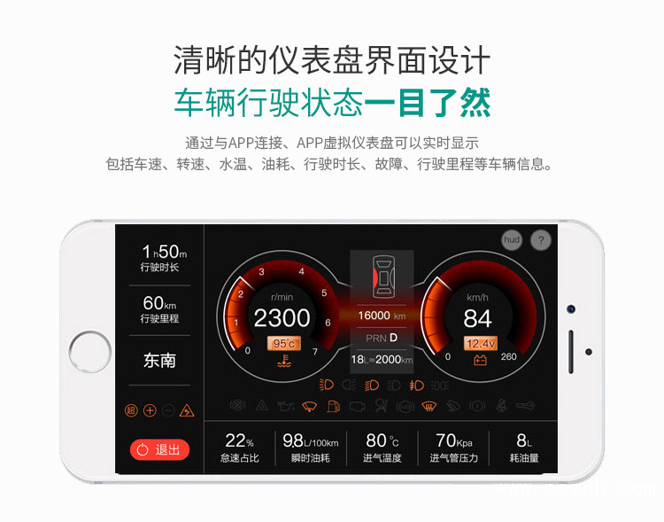 通過與APP連接、APP虛擬儀表盤可以實時顯示包括車速、轉速、水溫、油耗、行駛時長、故障、行駛里程等車輛信息。
