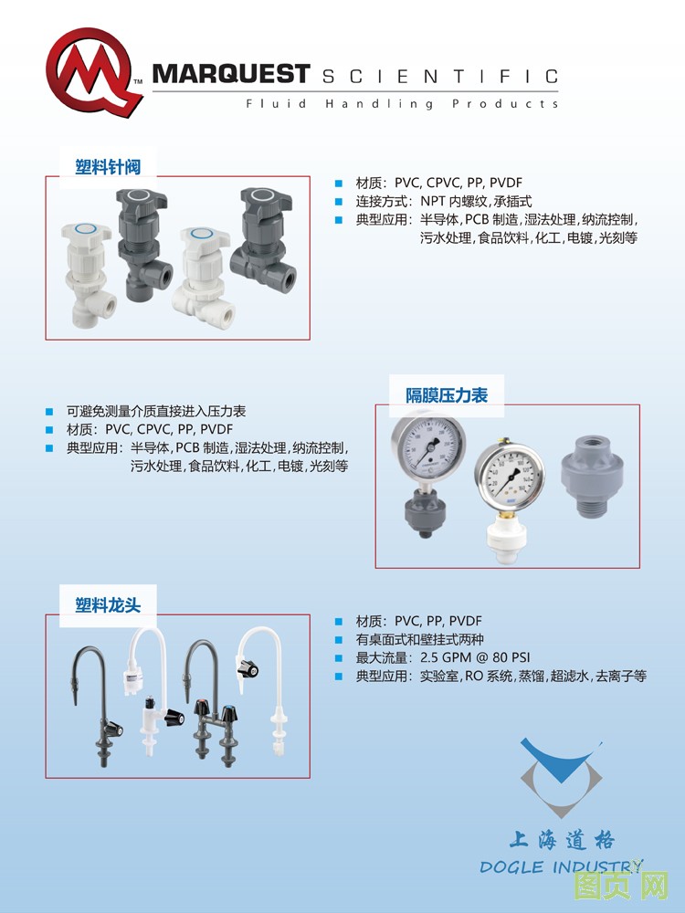 美國Marquest Scientific成立于1979年,通過持續(xù)不斷的技術(shù)創(chuàng)新,為流體處理和控制行業(yè)提供解決方案。Marquest主要產(chǎn)品包括塑料針閥、塑料龍頭、塑料隔膜壓力表等,適用于實(shí)驗(yàn)室、RO系統(tǒng)、光伏、半導(dǎo)體、PCB制造、食品飲料等行業(yè)。