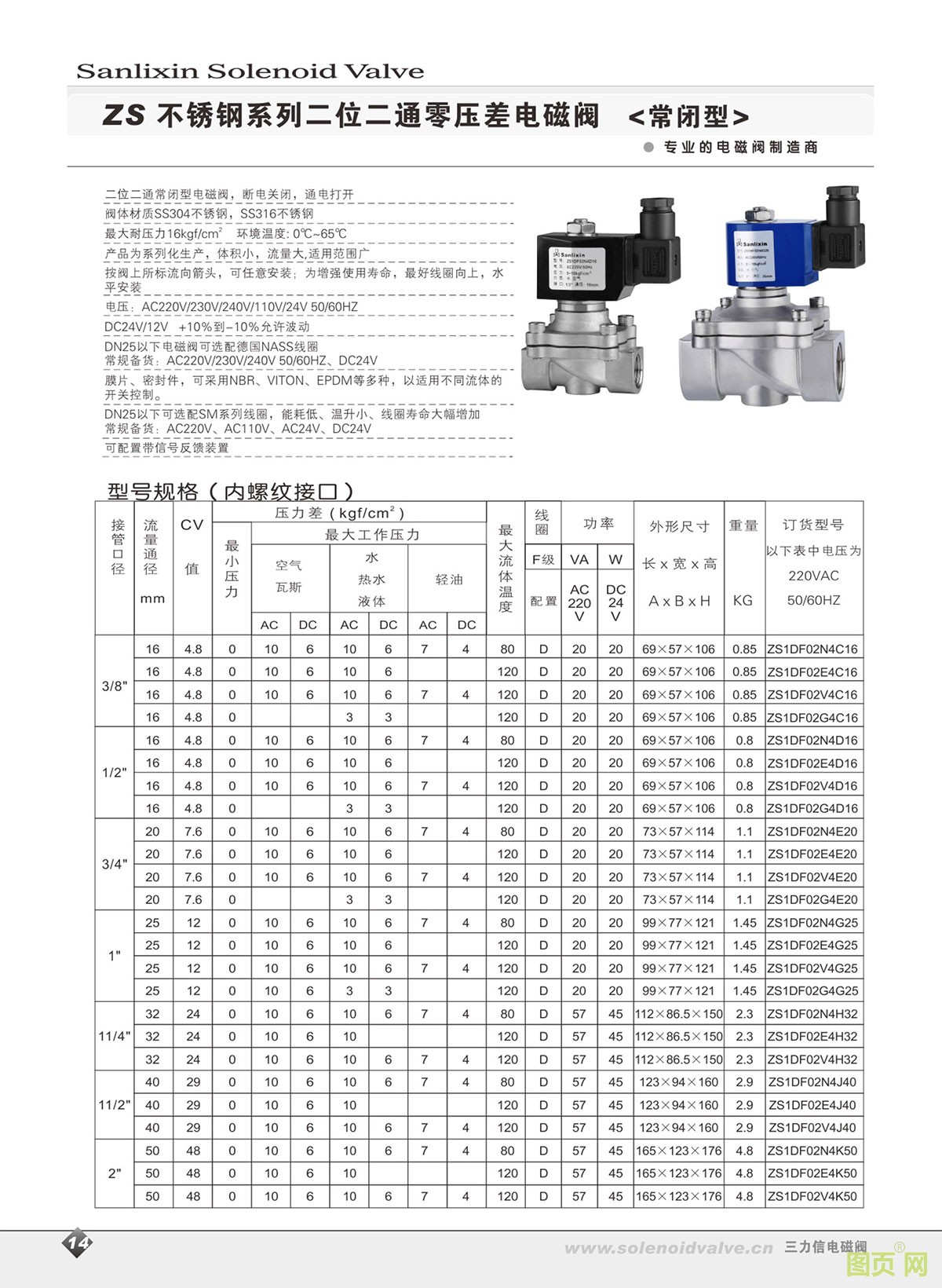 本網頁所展示的有關【三力信_ZS二位二通大口徑直動式電磁閥/常閉型 _電磁閥】的信息/圖片/參數等由的會員【余姚市三力信電磁閥有限公司 】提供,由圖頁網會員【余姚市三力信電磁閥有限公司 】自行對信息/圖片/參數等的真實性、準確性和合法性負責,本平臺(本網站)僅提供展示服務,請謹慎交易,因交易而產生的法律關系及法律糾紛由您自行協商解決,本平臺(本網站)對此不承擔任何責任。您在本網頁可以瀏覽【三力信_ZS二位二通大口徑直動式電磁閥/常閉型 _電磁閥】有關的信息/圖片/價格等及提供 【三力信_ZS二位二通大口徑直動式電磁閥/常閉型 _電磁閥】的商家公司簡介、聯系方式等信息。