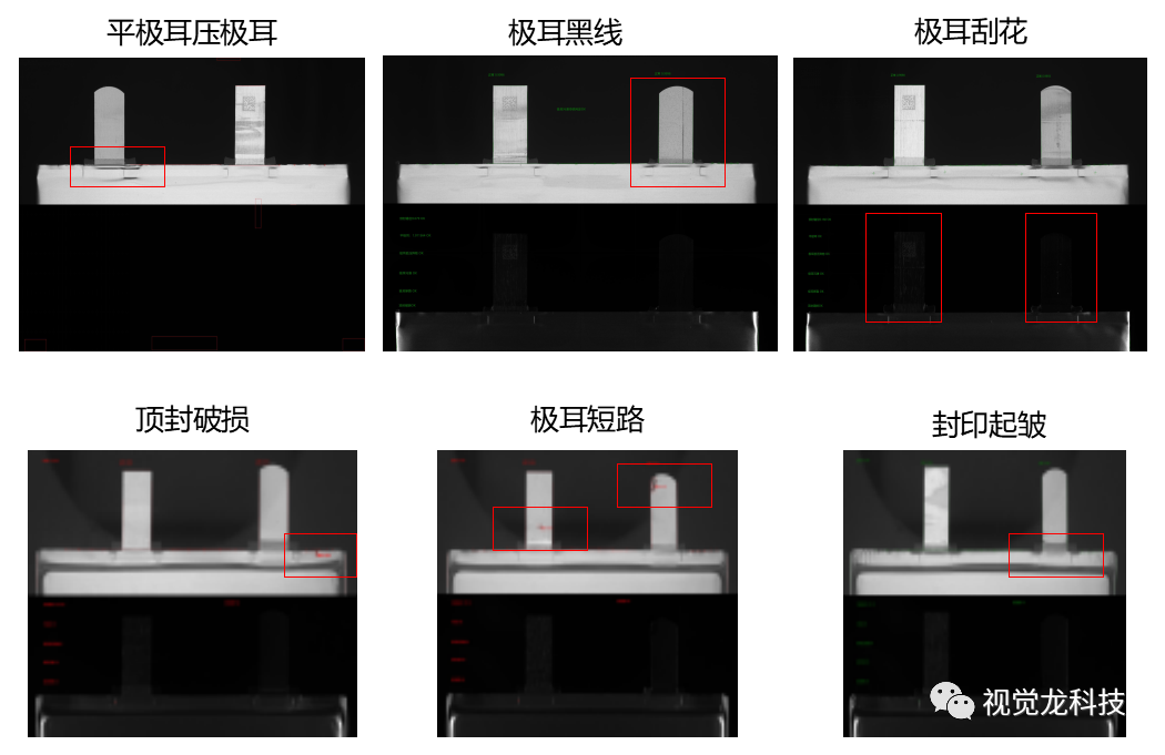 本項目檢測電芯外觀52種缺陷類型,120多種缺陷項。包含凸點、切邊不良、主體變形、角位變形、破損、脹氣、腐蝕、漏液、異色點、異物、鋁塑膜黑線、電解液、劃傷、極耳短路、頂封短路、極耳黑線、極耳斷裂、極片翻折、鋁箔翻折等缺陷。致命不良(零漏檢)缺陷包含破損、脹氣、切邊不良、角位變形、極耳短路、主體變形、極片翻折、雙極耳、無極耳膠、邊電壓刺破、封印封斜、封印壓異物、封印起皺、壓極耳、脹氣、主體內異物等。