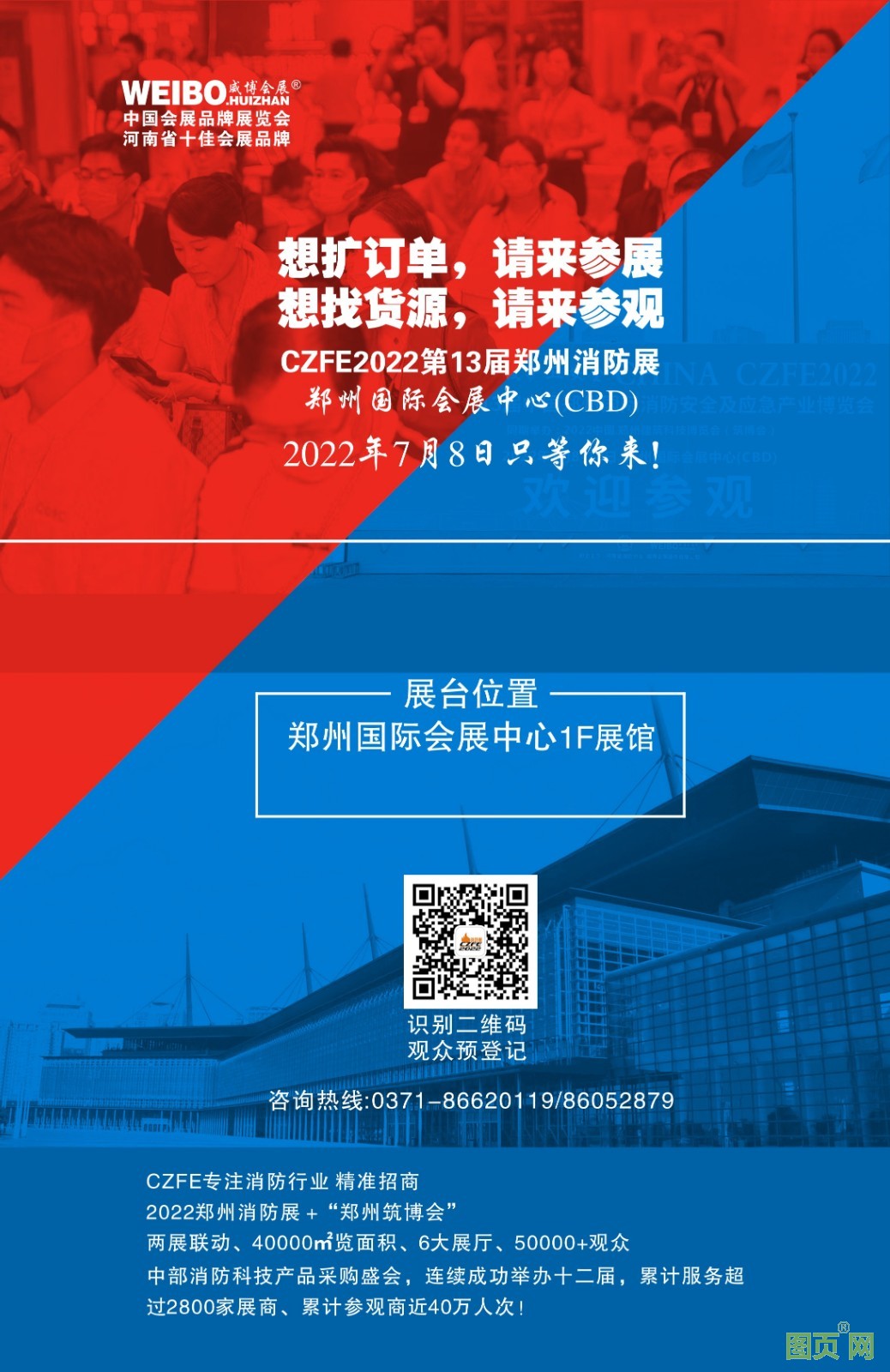 2022年7月8-10日,在鄭州國際會展中心(CBD)由威博會展旗下舉辦的“2022中國.鄭州消防安全與應急產業博覽會& 2022中國.鄭州建筑防火與耐火/阻燃材料展(CZFE鄭州消防展)”將與“2022中國.鄭州裝配式建筑與建筑科技產品博覽會(筑博會)”聯袂舉辦。