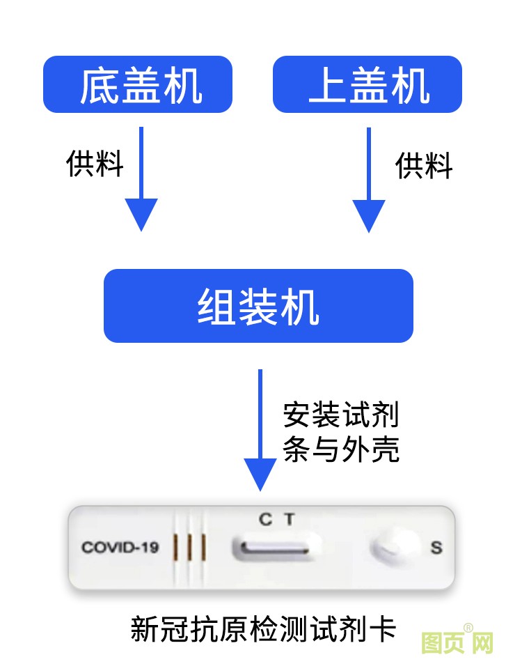 抗原檢測試劑卡分為三部分:上蓋、底蓋、試劑條,所以抗原檢測試劑卡生產(chǎn)設(shè)備由上蓋機、底蓋機、組裝機三部分組成。