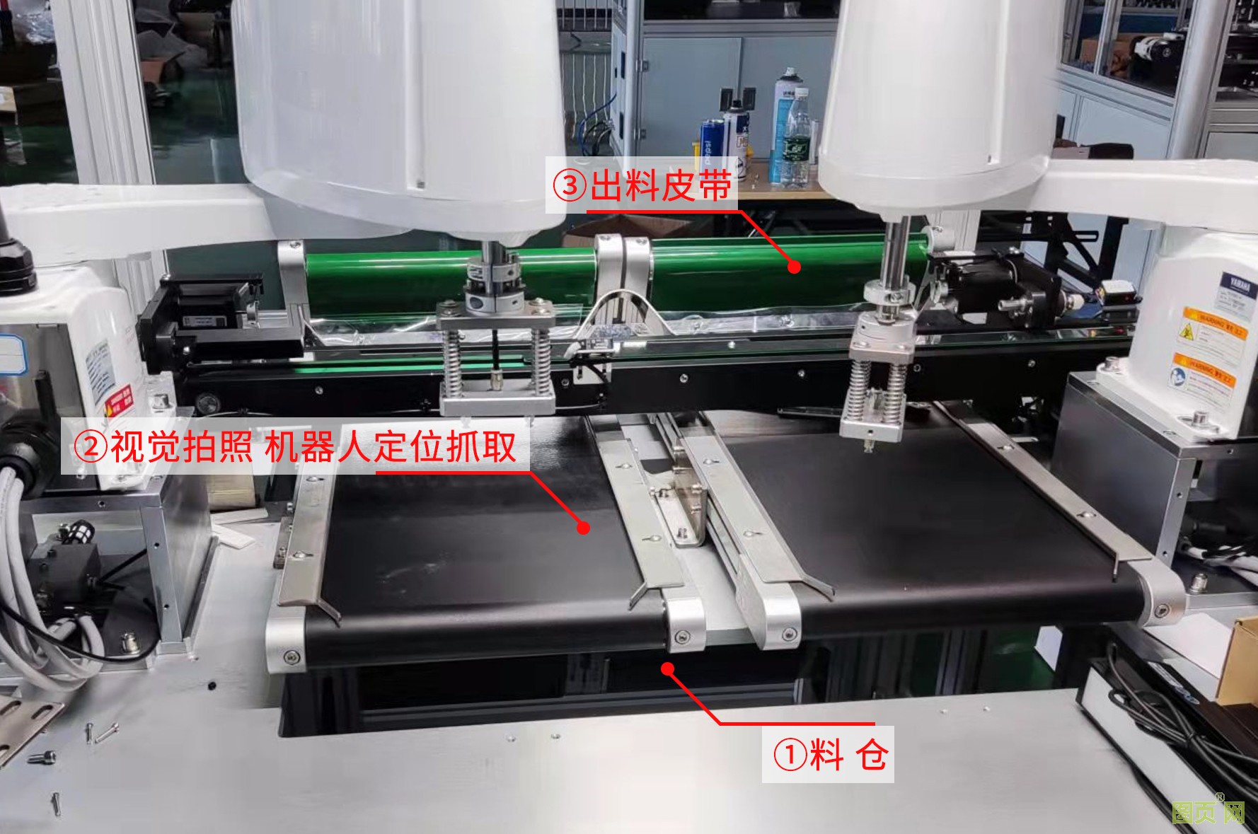 上蓋機配備一臺匯川H3U系列的PLC和一臺7寸的觸摸屏,主要控制步進電機給機器人進行供料。另外還配備兩臺4軸SCARA機器人和視覺系統(tǒng),通過視覺拍照定位把蓋子的坐標位置反饋給機器人讓其進行取料操作。