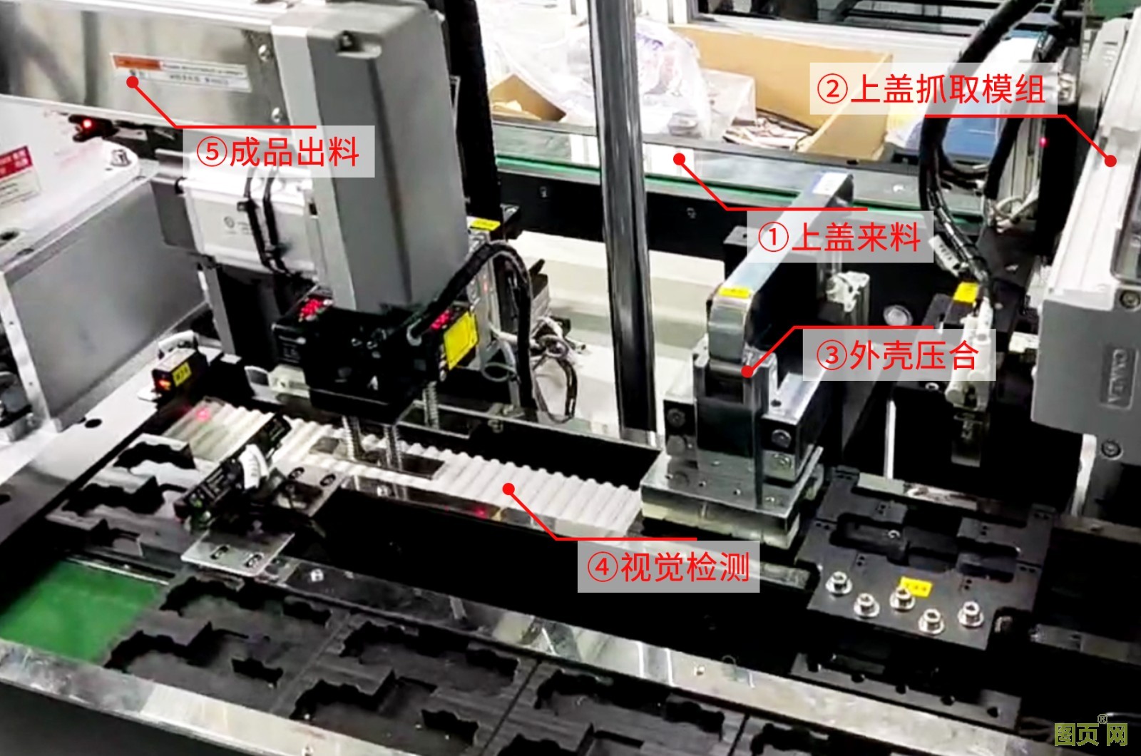 上蓋機和底蓋機負責(zé)給組裝機供料,組裝機安放好試劑條后把外殼進行壓合組裝,一個完整的抗原檢測試劑卡就組裝完畢。