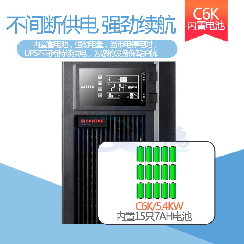 青鵬科技ups電源設備西安地區山特UPS電源C10K,C6K,C3K,C2K,C1K標機分別內置16只17AH蓄電池,8只17AH蓄電池,6只17AH蓄電池,3只17AH蓄電池,2只17AH蓄電池,如果需要更長斷電時間需要選購山特UPS電源C10KS,C6KS,C3KS,C2KS,C1KS長效機器后備時間15分鐘以上的請聯系西安ups電源設備銷售C10KUPS電源不間斷系列產品咨詢配置方案。