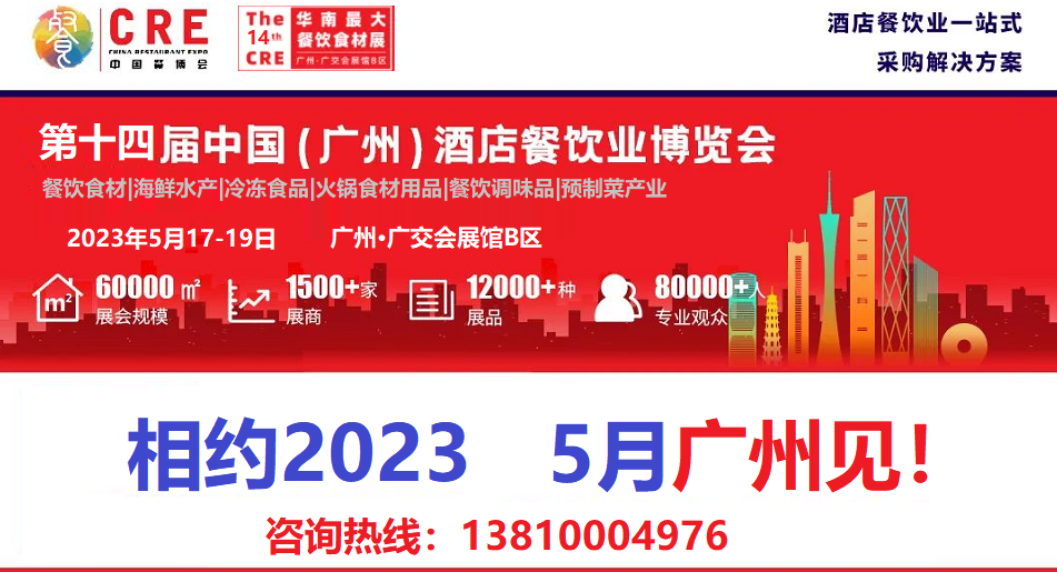 搶占新商機(jī),布局新規(guī)劃,采購新產(chǎn)品,前瞻新趨勢,優(yōu)享新體驗,就在2023年5月17日-19日廣州·廣交會展館B區(qū),2023第十四屆中國(廣州)酒店餐飲業(yè)博覽會!2023餐飲業(yè)年度盛會,歡迎您的報名參與!