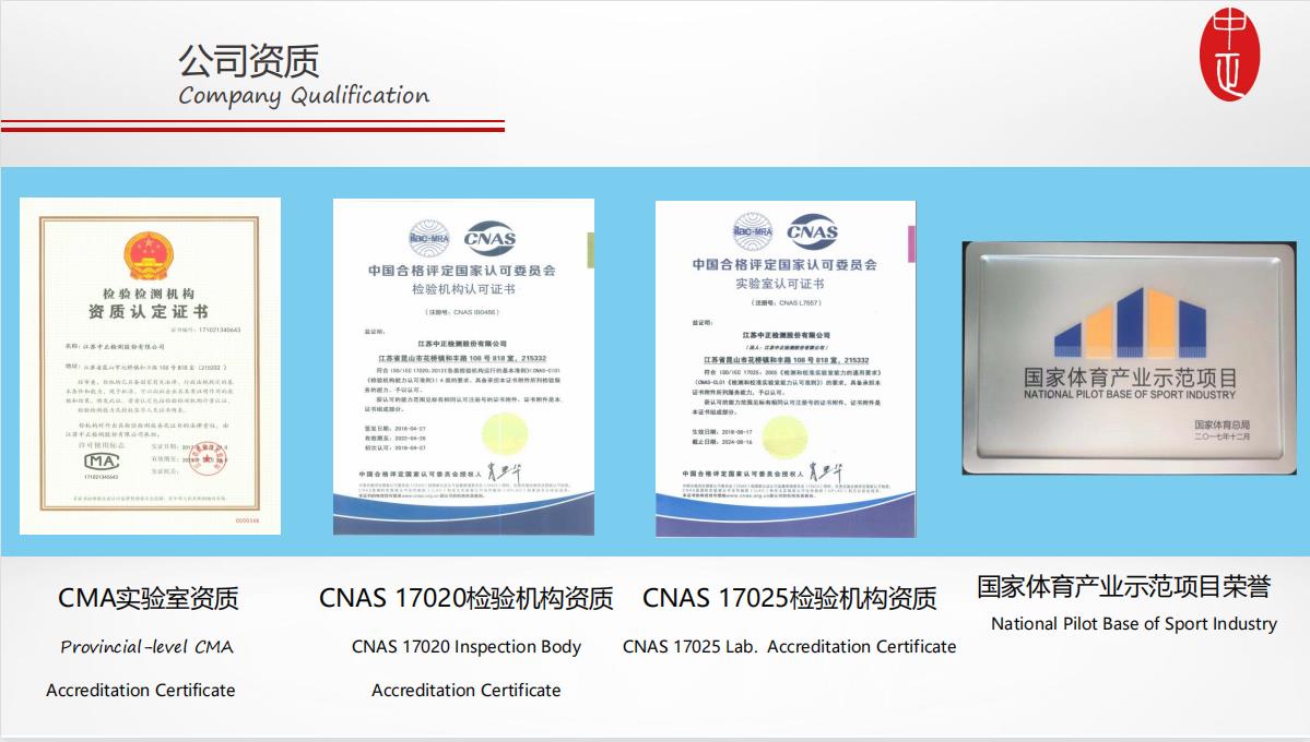 江蘇中正檢測股份有限公司(簡稱中正檢測),是合法從事國際體育協會檢測認證、體育場館測試、高危場館檢測的第三方服務機構,致力于全球商品供應鏈的質量鑒定和審核業務,專注于提供各個行業的質量解決方案。