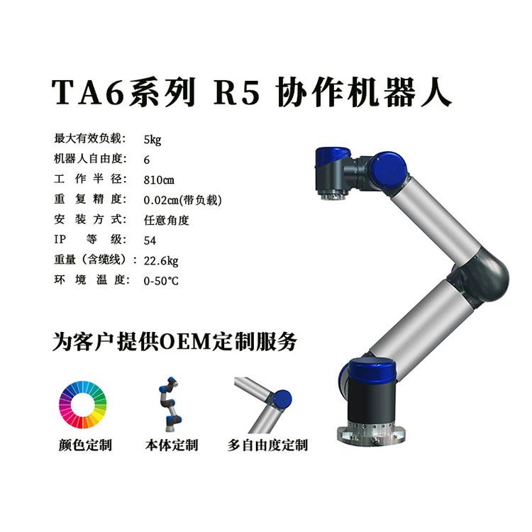 深圳泰科TA6系列協作機器人是泰科智能自主研發的6自由度的協作機器人,具有拖動示教、安全防碰撞等功能,可以直接與人協同工作。 采用自主設計的RJS系列關節模組,既輕便靈活、運行平滑柔順,同時滿足負荷的需求。既有強大的通用性、 協作性與開放性,適用于物流裝配、流水線生產、上下料、AGV、3C電子、科研、醫療等行業。TA6系列協作機器人安裝簡單(安裝方式任意角度)及用途多樣化,不管您是什么行業或者產品,都可以很好的融入到各個生產流程,提升您工廠的生產效率,并更好的節約人工成本。