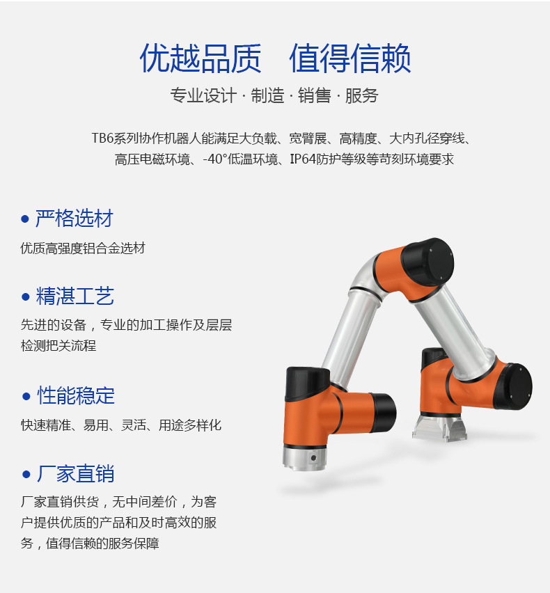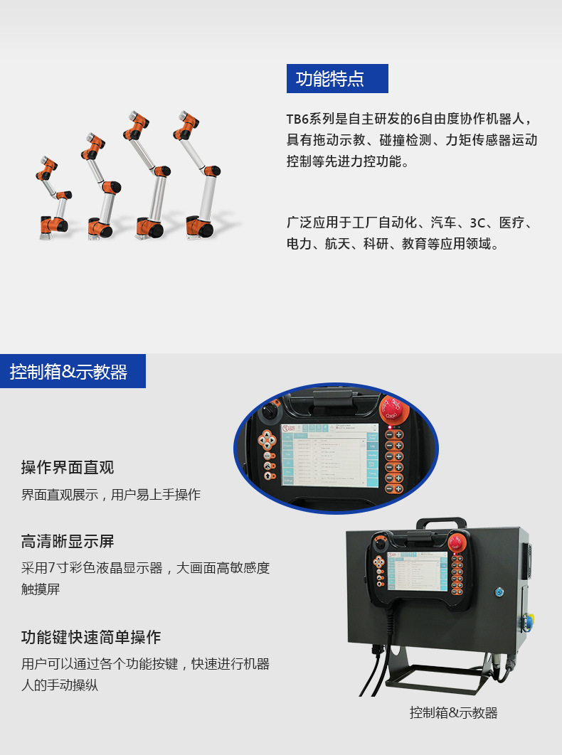 深圳泰科智能TB6系列協作機器人是泰科智能自主研發的6軸輕型協作機器人,具有拖動示教、安全防碰撞等功能,可以直接與人協同工作。采用自主設計研發RJSII系列關節模組,既輕便靈活、運行平滑柔順,同時滿足負荷的需求。防護等級高,可適用于更多苛刻的工作環境,既有強大的通用性、 協作性與開放性,廣泛應用于物流裝配、流水線生產、上下料、AGV、3C電子、科研、醫療等行業領域。安裝簡單(安裝方式任意角度)及用途多樣化,提升產品品質和生產效率,并更好的節約人工成本。