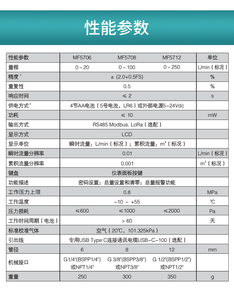 量程 (0~20)L/min, (0~100)L/min, (0~250)L/min,