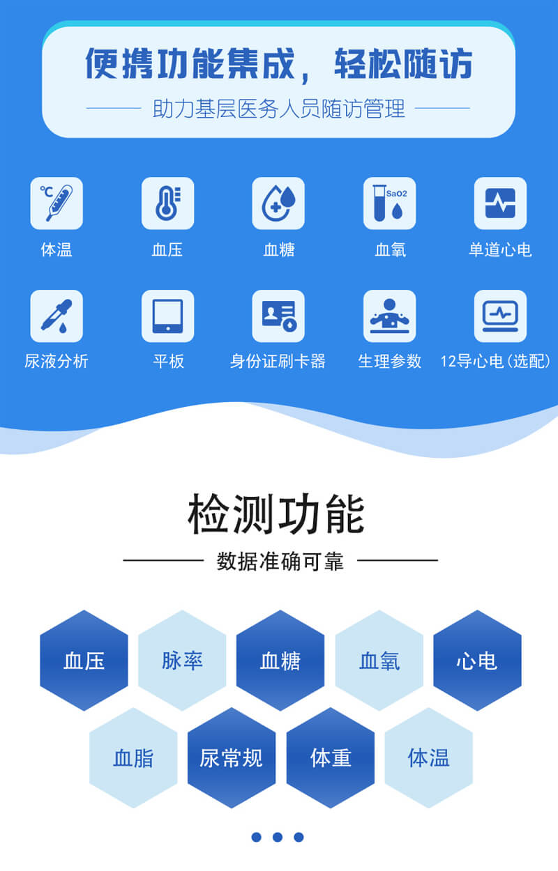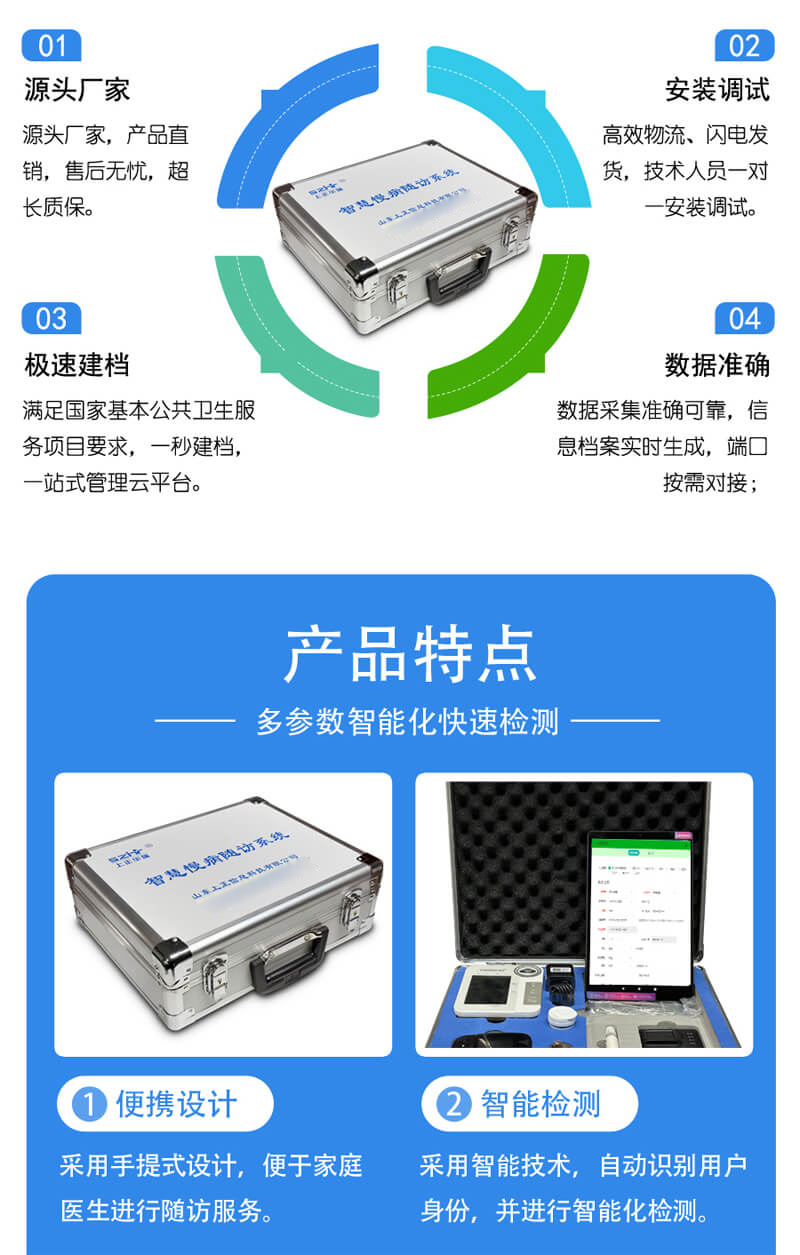 全面覆蓋慢性病監測需求:上正華瑞村醫隨訪包集成了多種體檢項目,如血壓、血糖、心電圖、血氧等,能夠全面覆蓋慢性病的監測需求。這有助于村醫全面了解患者的健康狀況,及時發現病情變化。