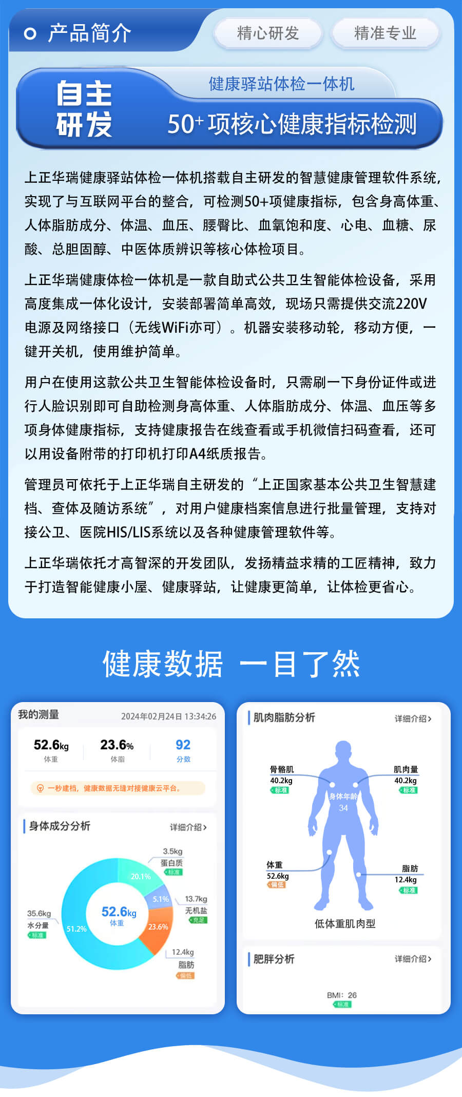 3、促進健康管理:上正華瑞臺式健康一體機不僅提供檢測數據,還可以結合數據分析功能,為居民提供個性化的健康管理建議。通過持續監測和數據分析,居民可以更好地了解自己的健康狀況,制定更加科學的健康管理計劃。
