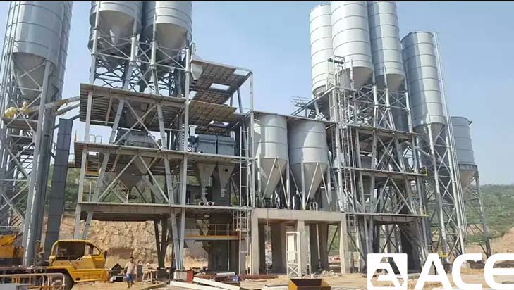 干混砂漿廠(又稱干混砂漿廠、干混砂漿制造廠、干混砂漿生產(chǎn)線),主要由原料儲存系統(tǒng)、砂石烘干系統(tǒng)、配料系統(tǒng)、攪拌系統(tǒng)、成品料倉、輸送提升系統(tǒng)、包裝機、收塵系統(tǒng)、電控系統(tǒng)組成。